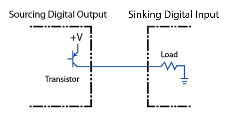 Figure 1: Sinking digital output is connected to a sourcing digital input. In this circuit, the load is pulled to ground by the provided sinking digital output.